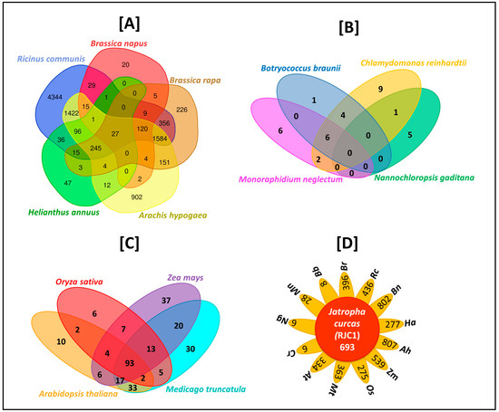 Figure 5. Venn diagrams depicting the comparative analysis for 693 conserved lipid-metabolizing genes of J.curcas between (A) Oil-producing plants (Brassica napus: Bn; Brassica rapa: Br; Arachis hypogaea: Ah; Helianthus annuus: Ha, and Ricinus communis: Rc); (B) Oil-producing algae (Botryococcus braunii: Bb; Chlamydomonas reinhardtii: Cr; Monoraphidium neglectum: Mn, and Nannochloropsis gaditana: Ng); (C) Model plant species (Oryza sativa: Os; Zea mays: Zm; Medicago truncatula: Mt, and Arabidopsis thaliana: At). Plot; (D) shows the 13 plant species having gene conservation with 693 RJC1 lipid-metabolizing genes. The middle circle depicts a total of 693 RJC1 lipid-metabolizing genes, and leaves depicts the individual gene numbers of each of the 13 plant species.