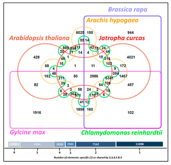 Figure 6. Venn diagram representing the orthologous protein clusters shared among J. curcas, Glycine max, Arabidopsis thaliana, Arachis hypogaea, Brassica rapa, and Chlamydomonas reinhardtii.