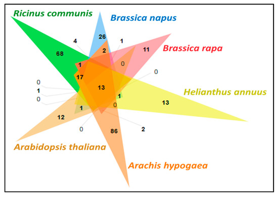 Figure 7. Comprehensive comparative protein analysis of RJC1 with Ricinus communis, Brassica napus, Brassica rapa, Helianthus annuus, Arachis hypogaea, and Arabidopsis thaliana.
