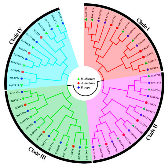 Phylogenetic tree of B. oleracea, Brassica rapa, and A. thaliana STP proteins. Phylogenetic analysis of 58 STP proteins from B. oleracea (22), B. rapa (22), and A. thaliana (14) showing similar groups in the three species. Four clades were marked with different background colors.