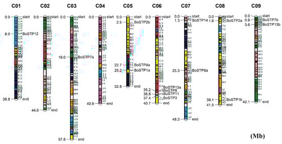 Distribution of BoSTP genes on the nine chromosomes of B. oleracea. The 24 conserved collinear blocks on each chromosome are labeled A–X and the three sub-genomes are plotted, based on a previous report [37].