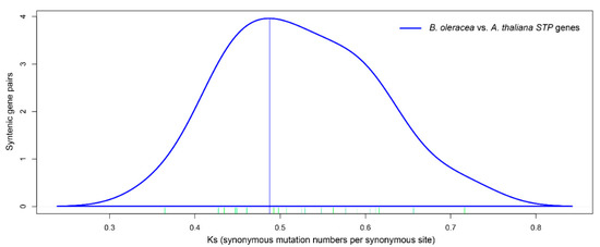 According to the 22 syntenic STP orthologous pairs between B. oleracea and A. thaliana, the Ks and Ka values of these homologous genes were calculated by DnaSP 6 software (Table 2; Supplementary File S3). The Ka/Ks values of all the syntenic STP orthologous pairs were far less than 1, suggesting that these STP genes have undergone purifying selection. The Ks values of B. oleracea relative to A. thaliana ranged from 0.43 to 0.60 and concentrated at 0.49 (Figure 4), which indicated that these STP genes of B. oleracea diverged from A. thaliana approximately 16.3 MYA. We concluded that these STP genes diverged following the Brassica-specific WGT event that occurred approximately 13–17 MYA [38,56].