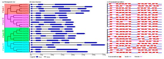 Gene structures and transmembrane helices (TMHs) of BoSTP genes. (a) An unrooted phylogenetic tree was constructed based on the full-length amino acid alignment of all the BoSTP proteins using the maximum likelihood (ML) method. (b) Structures of BoSTP genes. Exons and introns are represented by blue double-sided wedges and black lines, respectively. (c) TMHs of BoSTP proteins. Red rectangles signify the transmembrane regions, blue and carmine lines indicate the intracellular and extracellular regions, respectively.