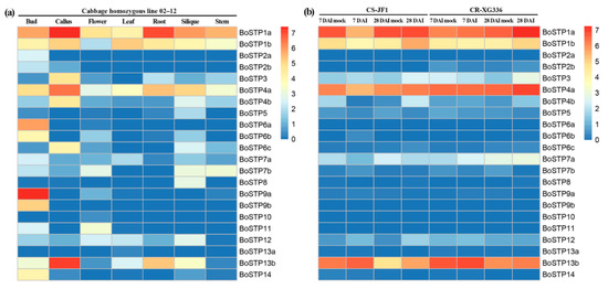 Organ-specific gene expression can provide valuable information about the function of BoSTPs in different organs. Thus, the transcript levels of the BoSTP genes in the bud, callus, flower, leaf, root, silique, and stem of cabbage derived from the RNA-Seq dataset (GSE42891) were analyzed. The heatmap revealed that a large portion of BoSTP genes were organ-specific (Figure 6a; Supplementary File S5). For example, several BoSTP genes were expressed in only one or two organ types, such as BoSTP2a in buds, BoSTP13a in leaves, BoSTP2b in buds and calli, and BoSTP6a and BoSTP10 in buds and flowers (Figure 6a). A total of seven BoSTP genes were expressed in all the organs, including BoSTP1a, BoSTP1b, BoSTP4a, BoSTP4b, BoSTP7a, BoSTP12, and BoSTP13b. The diversity of the expression profiles of BoSTP genes suggested a broad range of biological functions during the growth and development of cabbage.