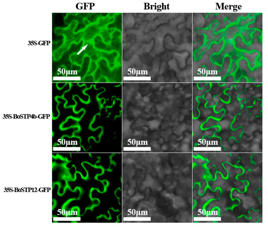 In silico subcellular localization prediction using Plant-mPLoc [50] suggested that all the BoSTP proteins were localized in the cell membrane. To further characterize the subcellular localization of BoSTP proteins, BoSTP4b and BoSTP12 translational GFP fusion proteins were heterologously and transiently expressed in tobacco leaf epidermal cells. The GFP signal in epidermal cells transfected with the 35S-GFP was mainly found in the cell membrane, cytoplasm, and nucleus (Figure 7), whereas the GFP signals in epidermal cells transfected with 35S-BoSTP4b-GFP and 35S-BoSTP12-GFP fusion proteins were detected in the cell membrane (Figure 6), suggesting that the two BoSTPs are membrane proteins, consistent with the in silico prediction results.