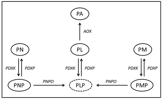 Schematic display of vitamin B6 metabolism. The different B6 vitamers pyridoxine (PN), pyridoxamine (PM), pyridoxal (PL) and their respective phosphate-esters (PNP, PMP and PLP) are interconvertible through the action of several enzymes. Pyridoxic acid (PA) is the main degradation product of vitamin B6. PDXK = pyridoxal kinase. PDXP = pyridoxal phosphatase. PNPO = pyridox(am)ine oxidase. AOX = aldehyde oxidase.