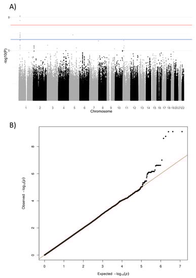 Manhattan plot of multivariate analysis of B6 metabolism in plasma and CSF (A). The red line indicates the genome-wide significance threshold of 5 × 10−8, the blue line 1 × 10−6. The QQ-plot of the association (B) indicating expected versus observed p-values. CSF: Cerebrospinal fluid; QQ-plot: Quantile-quantile-plot.