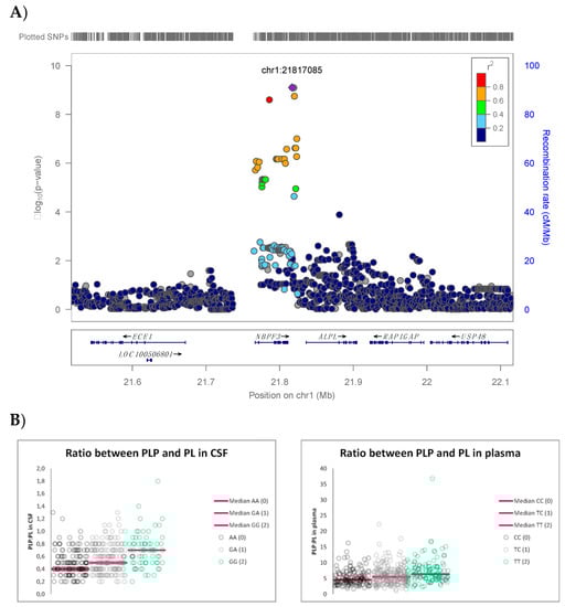 Regional association plot for the genome-wide significant locus for the ratio between PLP and PL on chromosome 1 (A) and scatterplots of the relation between genotype and measured PLP:PL in CSF (left) and plasma (right) (B).