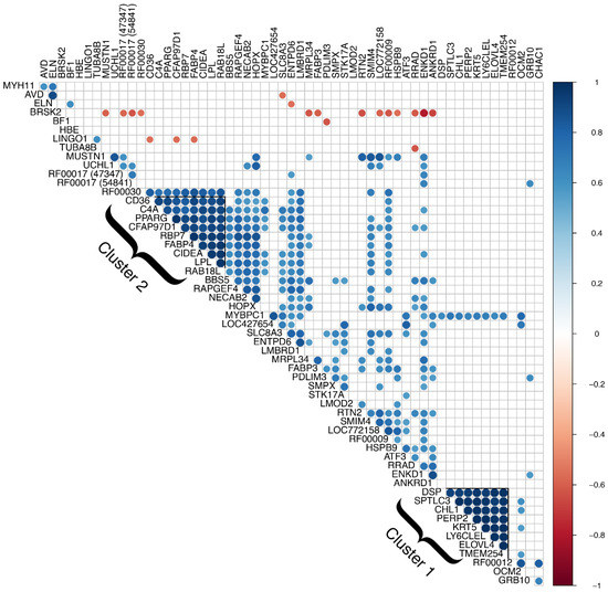 Correlation analysis of differentially expressed genes. Genes with significantly correlated expression (p-value ≤ 0.05) are shown in blue (positive correlation) and red (negative correlation). Two major clusters of genes have Pearson’s correlation coefficients greater than 0.8 for all gene pairs. Cluster 1 consists of 8 genes, all of which were excluded from further analysis due to presumed skin contamination. Cluster 2 consists of 9 genes related to lipid metabolism or adiposity traits.
