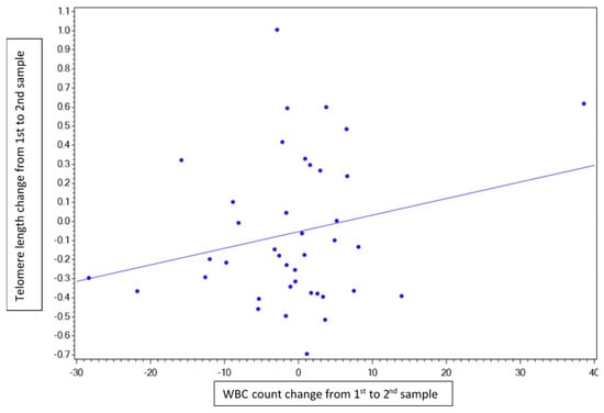 The age of patients demonstrating telomere shortening was statistically significantly younger (45.4 years vs. 61.5 years) compared with those showing increased telomere length (p < 0.023). A correlation was observed between a change in telomere length and a corresponding change in the repeated WBC count (i.e., telomere shortening was associated with a decreased WBC count on the second examination and telomere lengthening was associated with an increased WBC count on the second examination) with a Pearson correlation of 0.23 (Figure 2). There was no correlation between mortality and telomere length difference in any direction, as shown in Figure 3.