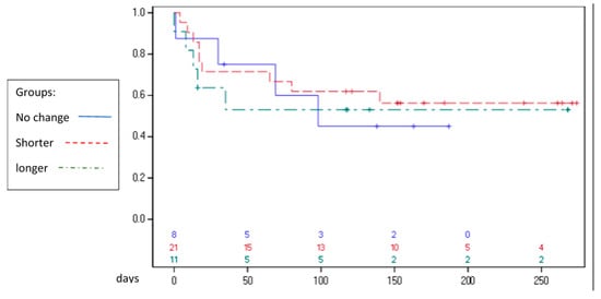 Regarding changes in telomere length, 32 (80%) patients demonstrated a significant change in length, of whom 11 (27.5%) showed an increase (from 23.7% to 100% of baseline) and 21 (52.5%) showed a decrease (69.5% to 17.6% of baseline). Eight patients did not show the threshold change of 15%; a detailed description of telomere length is given in Table 2.