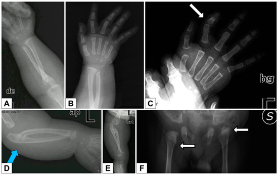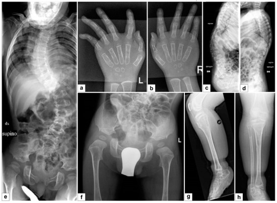 - Bonafe, L.; Cormier-Daire, V.; Hall, C.; Lachman, R.; Mortier, G.; Mundlos, S.; Nishimura, G.; Sangiorgi, L.; Savarirayan, R.; Sillence, D.; et al. Nosology and classification of genetic skeletal disorders: 2015 revision. Am. J. Med. Genet. Part A 2015, 167, 2869–2892. [Google Scholar] [CrossRef] [PubMed]