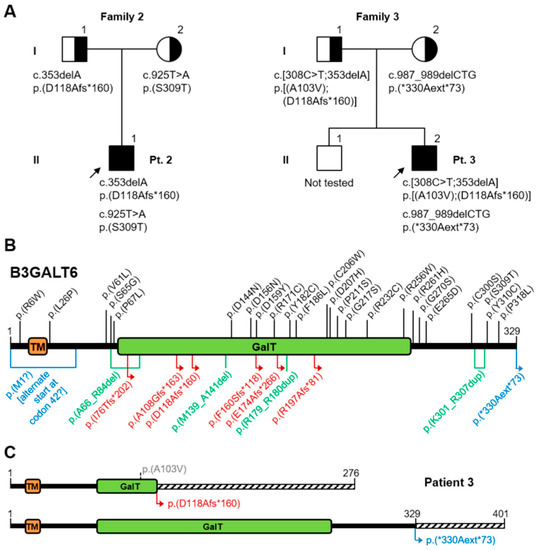 A) Pedigree of Families 2 and 3; B) Schematic representation of the B3GALT6 protein: TM = transmembrane domain, GalT = Galactosyl-transferase catalytic domain. Protein variants reported in the literature are annotated in the cartoon (see Table 2 for references). Top half: missense variants (black). Bottom half: frameshift variants (red), in-frame indels (green), other length-altering variants (blue); C) Protein projection of the two alleles from Pt.3; dashed boxes indicate an altered or extended reading frame.