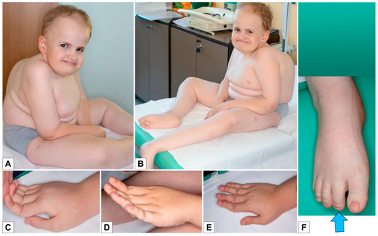 Examination at the age of 12 years and 11 months showed (Figure 8A–F): height 123 cm (<<3rd centile), weight 28 kg (<3rd centile), head circumference 52 cm (10th centile), span 113 cm, span/height ratio 0.91. Pubertal stage were A0P1B1, with testicular volume of 1-2 ml bilaterally. He had sparse hair, high and prominent forehead with high hairline, mild bitemporal depression, fairly large ears, blue-gray sclerae, malar hypoplasia, hypoplastic columella, short philtrum, small misaligned teeth in the lower jaw, flat palate with longitudinal median mucous thickening (Figure 8A–B). He had thin, pale, soft skin, with slightly prominent veins on trunk, limited elbow extension, skin hyperextensibility and distal joint hypermobility especially of the hands (Beighton scale: 6), long and tapered fingers with a tendency to ulnar deviation (Figure 8C–E), hypoplastic nails on the feet (Figure 8F).