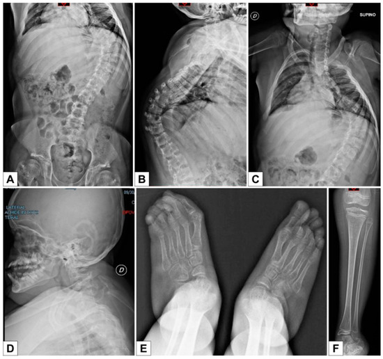 Skeletal X-rays demonstrated severe kyphoscoliosis, osteopenia (especially in the acetabula, femurs, tibiae and fibulae), and thin metacarpals, metatarsals and phalanges (Figure 9A–F).