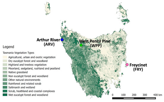 Map of our three geographic sampling locations across Tasmania showing the vegetation distribution across Tasmania.