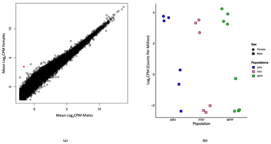 Scatterplot showing the Log2CPM (log-transformed counts per million) values between (a) males and females, with the red point indicative of the gene FRMD7. (b) Scatterplot showing the Log2CPM values for the gene FRMD7 in males and females within each population. There was significant differential gene expression in FRMD7 between the sexes (circles for females and squares for males) across all populations sampled from different geographic locations.