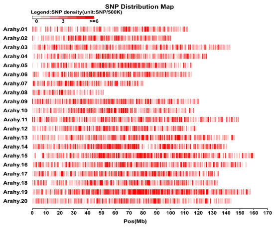 Single nucleotide polymorphisms (SNP) distribution in the 20 chromosomes of the cultivated peanut. The horizontal axis shows chromosome length (Mb), the shades of red represent SNP density (the number of SNPs per window). The vertical axis shows the 20 chromosomes.
