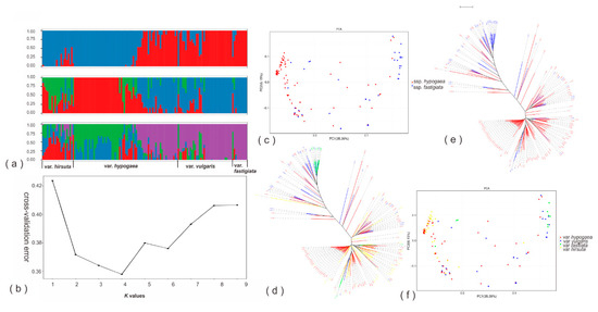 Results from the principal component analysis (PCA) were in accordance with those of the phylogenetic analysis (Figure 2c,f). The population structure of the studied peanut samples was further investigated by the Admixture software. Out of the 10 tested potential numbers (K: 1–10) of ancestral populations, K = 4 represented the most sensible choice according to cross-validation error value: It has the lowest value (Figure 2b), however its difference with K = 3 was small (Figure 2b). For K = 4, the first three ancestral populations (green, blue, and red, Figure 2a) were dominated by individuals from A. hypogaea var. hirsuta and var. hypogaea, while the fourth ancestral population (purple) prevailed the genetic makeups of var. vulgaris, var. fastigiata and ca. 40% of var. hypogaea. For K = 3, again var. hirsuta and a big part of var. hypogaea dominated the first two ancestral populations (green and red) while the rest of the peanut accessions constituted the majority of the third population (blue). Overall, the results of both K = 3 and 4 agreed well with that of K = 2; for the latter, the first population was mostly composed of individuals from var. hirsuta and a big part of var. hypogaea, whereas the second ancestral population had var. vulgaris, var. fastigiata and ca. 40% of the var. hypogaea individuals as its main members.