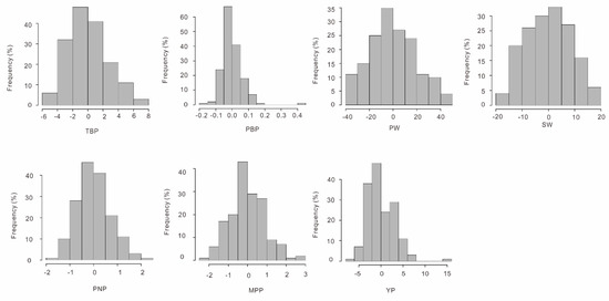 One hundred and sixty-five out of the 195 studied peanut accessions have been phenotyped for three years at three different locations, and based on these phenotype data, the correlation and the heritability of seven agronomic traits (hundred-seed weight (SW), hundred-pod weight (PW), yield per plant (YP), mature pod number per plant (MPP), pod number per plant (PNP), pod branch number per plant (PBP), and total branch number per plant (TBP)) were estimated. All seven traits were found to follow the normal distribution without any significant skewness and kurtosis (Figure 3). The correlation between the seven traits were all positive, with the correlation coefficient (r) estimates being, or less than, 0.45, except those for the trait pairs YP–PBP/MPP/SW/PW (0.60–0.66), as well as SW–PW (0.91) and MPP–PBP (0.93) (Figure S3). The broad-sense heritability (H2) for SW (H2 = 0.72) and PW (0.63) were the highest among the seven agronomic traits, while those for PBP (0.04), PNP (0.14), and MPP (0.19) were the lowest, and those for TBP (0.54) and YP (0.39) were in the middle (Table 1).