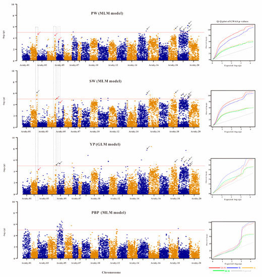 Manhattan plots showing the associations of all SNPs with four yield-related traits. The four yield-related traits are, respectively, hundred-pod weight (PW), hundred-seed weight (SW), yield per plant (YP), and pod branch number per plant (PBP). For each trait, the Q–Q plots from four different statistical models are also shown in the right. The shown Manhattan plots are from the best statistical models (according to Q–Q plots). On chromosomes Arahy.15, Arahy.18, and Arahy.19, there are, respectively, one, one, and five SNPs (see the black arrows in these regions) that are associated with PW, SW, and YP. On chromosomes Arahy.02, Arahy.04 and Arahy.05, the dashed blocks enclose, respectively, one SNP cluster where the top SNP is significantly (black arrow) or not significantly (red arrow) associated with traits SW, PW, and YP. The significance level is log10 (0.05/13435) = 5.3 (the red horizontal line).