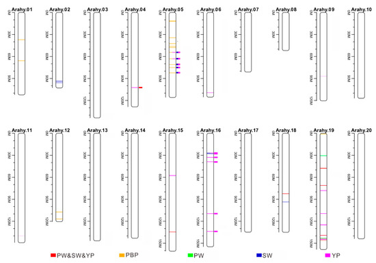 Quantitative trait loci (QTLs) identified to be associated with yield-related traits by both the current GWAS and earlier QTL mapping studies. The orange, green, blue, and magenta colors, respectively, for the yield-related traits PBP, PW, SW, and YP. The colorful lines represent the QTLs identified by the present study, the solid squares point to the QTLs that are co-localized with earlier identified QTLs. Most of these co-localized QTLs are located on chromosomes Arahy.05 and Arahy.16.
