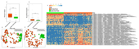 Principal coordinates analysis (PCoA) based on the Bray–Curtis (Figure 1D and Figure S2C) and Jaccard (Figure 1E and Figure S2D) distances revealed distinct clustering patterns between wild and captive pandas (Mann–Whitney test, p < 0.01).
