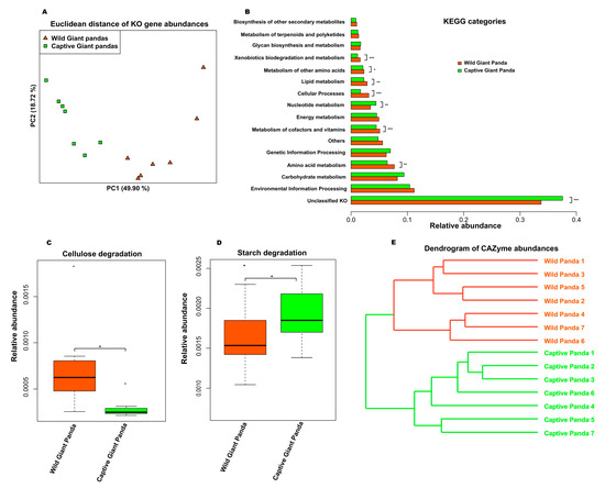 Metagenomic analysis of the functional potential of the giant panda microbiome. (A) Principal coordinates analysis based on Euclidean distances of all functional genes and pathways shows distinct clustering patterns between wild and captive pandas. (B) The relative abundances of KEGG Orthology. The relative abundance of CAZy families for cellulose (C) and starch (D) degradation. Boxplot indicates the interquartile range (IQR), lines inside boxes denote the median, and error bars represent the lowest and highest values, respectively. (E) UPGMA-clustered CAZyme dendrogram. * p < 0.05, ** p < 0.01, and *** p < 0.001, Mann–Whitney U test.