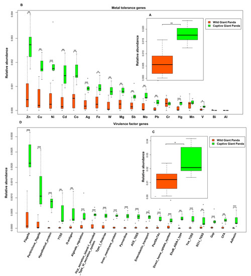 The relative abundances of metal tolerance and virulence factor genes in the giant panda microbiome. (A) Metal tolerance gene relative abundances. (B) Comparison of metal resistance gene relative abundances in the microbiomes of wild and captive giant pandas. (C) Virulence factor gene relative abundances. (D) Comparison of virulence factor gene relative abundances in the microbiomes of wild and captive giant pandas. All boxplots indicate the interquartile range (IQR), lines inside boxes denote the median, and error bars represent the lowest and highest values, respectively. * p < 0.05, ** p < 0.01 and, *** p < 0.001, Mann–Whitney U test.