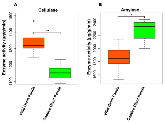 The cellulase (A) and amylase (B) activity based on the giant panda feces. * p < 0.05 and ** p < 0.01, Mann–Whitney U test.