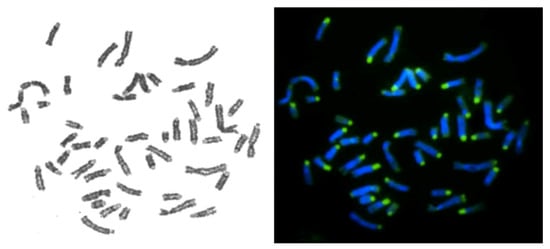 - Ijdo, J.W.; Wells, R.A.; Baldini, A.; Reeders, S.T. Improved telomere detection using a telomere repeat probe (TTAGGG) n generated by PCR. Nucleic Acids Res. 1991, 19, 4780. [Google Scholar] [CrossRef]
