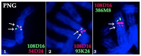 The duplication of the X chromosome segment in Pseudoryx nghetinhensis (PNG) shown by dual color FISH of cattle BAC-clones (pink and green) from CHORI-240 library. Three FISH experiments illustrate the revealed order of BACs on the X chromosome: 386M8, 108D16, 54D24, 93K24, 108D16. White arrows indicate the duplicated region corresponding to 108D16: 1, 2 –54D24 and 93K24 are between duplicated regions, 3 –386M8 is outside of duplicated region.