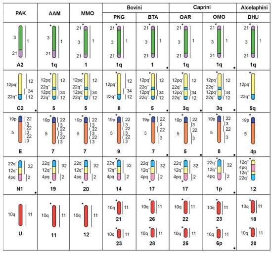 - Gallagher, D.S., Jr.; Womack, J.E. Chromosome conservation in the Bovidae. J. Hered. 1992, 83, 287–298. [Google Scholar] [CrossRef]