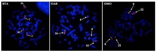 Localization of CDR 22 (green) and CDR 3 (pink) on BTA (Bos taurus), OAR (Ovis aries), and OMO (Ovibos moschatus) metaphase chromosomes by FISH showing additional previously unreported by painting fragment homologous to CDR22. White arrows indicate chromosomes with specific signal.