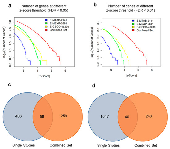 Identification of the DEGs by meta-analysis and comparison with the single study. (a) The number of DEGs in the log10 scale and their z-scores at false discovery rate (FDR) < 0.05 and (b) FDR < 0.01 were consistently increased in combined dataset. (c) A Venn-diagram of up-regulated DEGs. DEGs from single studies were the genes which appeared to be significant in at least one dataset (FDR < 0.01). (d) A Venn-diagram of down-regulated DEGs. All statistics for single studies and combined set were computed by GeneMeta R package.