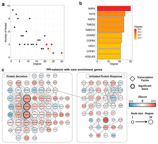 A protein-protein interaction (PPI)-network and its information obtained from protein secretion and unfolded protein response gene sets. (a) A Scatter plot showing the degree distribution. The nodes with the top 10 highest degrees were annotated with red dots. (b) The profiles and the degrees of the top 10 nodes. The color of the bar indicates the degree of the genes in PPI-network. (c) The PPI-network of protein secretion and unfolded protein responses and their link. The colors of nodes indicate up- or down-regulated genes. Red nodes indicate up-regulation and blue nodes indicate down-regulation. The sizes of the nodes are proportional to the degrees of the nodes. The identified novel genes were marked with double circles.
