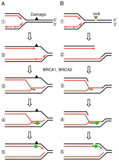 Double-strand breaks (DSBs) are the most genotoxic type of DNA lesion, and a single unrepaired DSB can trigger apoptosis. If misrepaired, DSBs often cause deletions and chromosome translocation, which may trigger carcinogenesis []. Lethal DSBs are generated not only by environmental mutagens such as ionizing-radiation but also by endogenous cellular processes, with several DSBs generated per cell cycle as a consequence of replication blockage at spontaneously arising DNA lesions (Figure 1) [,]. They include damaged nucleotides on template strands and single-strand breaks. Homology-directed repair (HDR) repairs DSBs using the homologous sister chromatid as the template DNA for repair. (Figure 1) []. Breast cancer susceptibility gene 1 (BRCA1) and breast cancer susceptibility gene 2 (BRCA2), are tumor suppressor proteins that play a key role in HDR (Figure 1) in cycling cells, and the loss of these proteins causes accumulation of DSBs. Mutations in the BRCA1 and BRCA2 genes predispose carriers to a higher risk of breast and ovarian cancer [,]. One major question in BRCA biology is why carcinogenesis occurs mainly in estrogen-regulated organs, arising in the epithelial cells in the mammary and ovarian ducts.