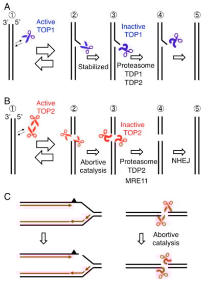 DNA replication and transcription overwind duplex DNA ahead of replication forks and transcription bubbles, respectively, and the resulting torsional stress would eventually stop DNA and RNA polymerases. Topoisomerase I (TOP1) cleaves one strand of a DNA double helix, allowing one end of the resulting single-strand break (SSB) to rotate around the uncut strand prior to re-ligation of the SSB and thereby resolving torsional stress []. TOP1 fails to re-ligate SSBs when TOP1 cleaves at ribonucleotides embedded in DNA and near ultraviolet (UV) lesions, abasic sites, or SSBs [,,,]. This failure causes the formation of stabilized TOP1 cleavage complexes (TOP1ccs), where SSBs are covalently attached to TOP1 at their 3′ end (Figure 2A). Tyrosyl-DNA phosphodiesterase 1 (TDP1) as well as tyrosyl-DNA phosphodiesterase 2 (TDP2) accurately removes such trapped TOP1 adducts from SSBs [,,]. Loss of these proteins causes spinocerebellar ataxia with axonal neuropathy [,], which is associated with the endogenous accumulation of stabilized TOP1ccs in neural tissue [,,], indicating that TOP1 is frequently trapped in the genomic DNA.