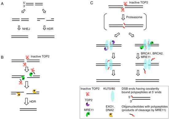 HDR efficiently removes 5′ TOP2 adducts at its initial step, DSB resection by MRE11 endonuclease (Figure 3B). In contrast with HDR, NHEJ requires 3′-OH and 5′-phosphate DSB ends, termed ‘clean’ DSB ends, for direct ligation []. NHEJ is initiated by binding of KU70/KU80 proteins and is completed by ligation by DNA ligase 4 (LIG4) (Figure 3C) []. Ligation by LIG4 requires ligatable DSB ends [,], including DSBs carrying ribonucleotides at their ends [], and NHEJ requires prior removal of blocking adducts and restoration of ligatable DSB ends. TDP2 and MRE11 remove 5′ TOP2 adducts prior to direct ligation by NHEJ (Figure 3C). The removal by TDP2 has two routes either digestion of 5′ TOP2 adducts by the proteasome prior to TDP2 action or interaction of the TOP2ccs with the sumo ligase ZATT (ZNF451) to facilitate TDP2 action [,]. The contribution of MRE11 to the removal of 5′ TOP2 adducts is considerably larger than that of TDP2, as evidenced by the fact that the loss of MRE11, but not the loss of TDP2, results in endogenous accumulation of TOP2ccs [].