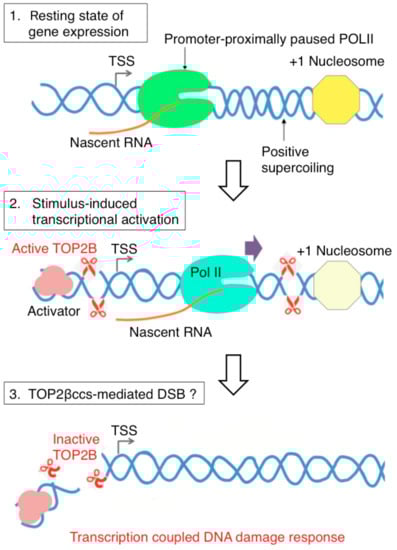 Pol II promoter pausing involves multiple layers of regulations exerted by protein and nucleic acid factors that control Pol II enzyme processivity and nucleosome architecture [,,]. In particular, recent studies have suggested that Pol II pausing is influenced by DNA torsion and that either negative or positive supercoiling can prevent Pol II from translocating on the DNA (Figure 4, Step 1) [,,,]. Biochemical analyses have demonstrated that TOP2B functions to resolve positive supercoiling ahead of transcribing Pol II [,,]. Contributed to by the +1 nucleosome, a characteristic of the signal-dependent genes utilizing Pol II pausing [,], the positive supercoiling is likely to be generated in the early elongation step in these genes (Figure 4, Step 2) [,]. It is thus speculated that the catalytic activity of TOP2B to remove the supercoiling is required for Pol II pause release and productive transcription [,,,,]. An interesting aspect of TOP2B function in Pol II pause release is that a DSB and DNA damage response involving diverse DNA repair factors are provoked in the process (Figure 4, Step 3), whereas TOP2B typically reseals the DSB immediately after resolving DNA torsion, without needing DNA repair factors. Therefore, it has been hypothesized that the TOP2B-mediated DSB during transcriptional pausing release is rather a persistent one that leads to the induction of the DNA damage response [].