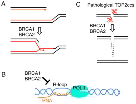 In addition to HDR (Figure 5A), BRCA1 and BRCA2 contribute to the maintenance of chromosomal DNA by suppressing the accumulation of RNA: DNA hybrid structures, which are known as R-loops (Figure 5B) and by promoting the repair of stalled TOP2ccs (Figure 5C). R-loop occurs co-transcriptionally at GC-rich sequences including G-quadruplex-containing sequences. R-loop formation is facilitated by SSBs and DSBs (reviewed in []) and seems to be induced by Pol II promoter pausing []. Replication blockage by R-loops causes genome instability and abnormal recombination, and it is believed that R-loops are not a serious threat to genome instability in G0/G1 phases (reviewed in []). Accumulating evidence implicate BRCA1 and BRCA2 in the turnover of R-loops (reviewed in []). BRCA1 removes R-loops by associating with Senataxin, a helicase implicated in the resolution of R-loops [,]. BRCA2 may bind to the branched structure formed at RNA: DNA hybrids and facilitate the access of Ribonuclease H1, an enzyme that selectively digests the RNA portion of an R-loops [,]. A recent study showed that BRCA2 binds to Pol II and controls the release of Pol II from promoter-proximal pausing sites []. BRCA2 inactivation results in accumulation of R-loops and DNA breakage at these sites. BRCA1, which was previously shown to co-immunoprecipitate with Pol II [], also suppresses the accumulation of R-loops specifically at promoter-proximal pausing sites []. Interestingly, this accumulation is detectable only in luminal epithelial cells of murine mammary glands []. These data suggest BRCA1 and BRCA2 prevent the oncogenesis of mammary epithelial cells by inhibiting abnormal R-loop formation (Figure 5B).