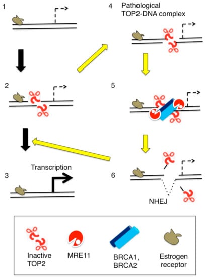 Estrogen-induced TOP2B catalysis causes the formation of stalled TOP2Bccs presumably at transcriptional regulatory sequences. (Step 1) Estrogen receptors (ER) bind at their target genes. (Step 2) TOP2B catalysis at transcriptional regulatory sequences, and (Step 3) estrogens upregulate the transcription of ER-target genes. (Step 4) TOP2B undergoes abortive catalysis generating stalled TOP2Bccs. (Step 5) From the resulting lethal DSBs TOP2B adducts are removed by the coordinated action of BRCA1, BRCA2, and Mre11. (Step 6) NHEJ seals DSBs leading a cycle of TOP2B-mediated catalyses (Step 2).