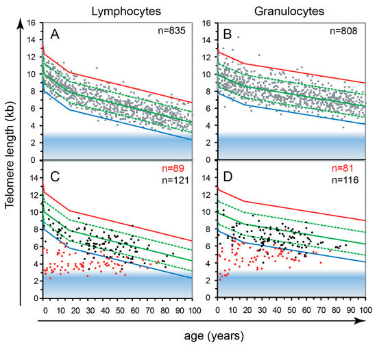 (A,B) Telomeres in human lymphocytes and granulocytes from peripheral blood shorten with age [15]. Fluorescence in situ hybridization followed by flow cytometry (Flow FISH) results from over 800 healthy individuals were used to calculate the distribution of telomere length at any given age (percentiles in population: solid green 50th; red 1st, blue 99th). Note the marked variation on average, cell specific telomere length at any given age. (C,D) The critical role of telomerase is illustrated by the telomere length in cells from patients that are haplo-insufficient for telomerase genes (red dots in C and D) compared to their unaffected siblings (black dots in C and D). The blue zone at the bottom of the graphs represents the area where telomeres are expected to be fully “uncapped” with less than 1 kb of TTAGGG repeats per chromosome end. Reproduced with permission from [12].