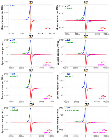 No spacers acquired due to priming at PPS were detected in DNA amplified from ΔrecB ΔrecJ and ΔrecB ΔsbcD double mutants, in agreement with lack of detectable expanded arrays bands in Figure 1D, so they were excluded from further analysis. Though the overall yield of spacer acquisition in ΔrecB, ΔrecC, and ΔrecD mutants, as judged by PCR analysis of CRISPR array amplicons, was the same as in parental KD403, mapping of acquired spacers revealed a clear alteration in their pattern. Specifically, compared to the “wild-type” strain, the area, from which spacers were acquired in the mutants was extended further away from the PPS in both directions. A similar, though less pronounced trend was observed for spacers acquired by the ΔsbcD mutant (Figure 2). In contrast, compared to parental KD403, no changes were observed in the size of the area from which spacer acquisition occurred in ΔrecJ or ΔsbcB single mutants or in the ΔrecB ΔsbcB double mutant compared to the ΔrecB single mutant.