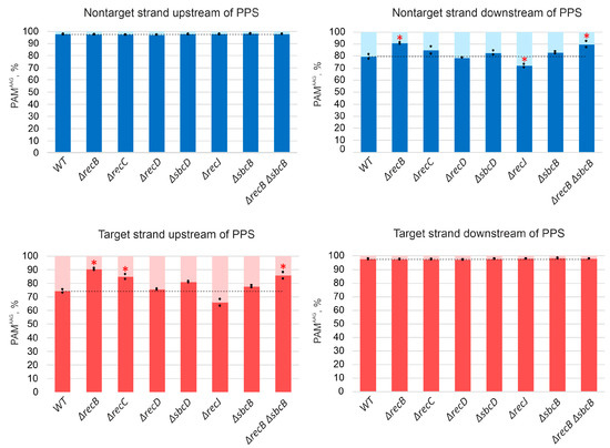 To find out how cell nucleases and helicases involved in genome maintenance and repair affect spacer acquisition at conditions of self-targeting, we first evaluated the role of the RecBCD complex, which is involved in homologous recombination induced by double-strand DNA breaks. After binding to the ends of a broken DNA duplex, RecBCD translocates along the DNA using 3’-5’ and 5’-3’ helicase activities of the RecB and RecD subunits, correspondingly, until a Chi site is recognized by the RecC subunit [39,40]. Whether RecBCD degrades DNA as it is moving along in vivo is still a subject to debate [39,41]. In vitro RecBCD possesses a Mg2+-dependent nuclease activity [42]. Upon Chi site recognition, RecB turns into an efficient processive 5’-3’ nuclease producing 3’ overhangs that initiate the process of homologous recombination. The absence of RecD converts the RecBC complex into a helicase that lacks the nuclease activity [43]. Previously, the role of the RecBCD complex in primed adaptation was assessed, and no impact was found [30]. We used P1 transduction to generate derivatives of the KD403 self-targeting strain with recB, recC, or recD genes replaced by kanamycin resistance cassette (see Materials and Methods). As in the parental, wild-type KD403 strain, induction of self-targeting in the mutants caused SOS response, as judged by the increase of cell length (Figures S3 and S4), cessation of culture growth (Figure S1), and reduction in colony forming units (Figure S2) but did not increase the number of dead cells 5 h after the addition of cas genes inducers as judged by differential staining of live and dead cells (Figure 1B and Figure S3). Spacer acquisition, detected by the appearance of PCR amplicons corresponding to extended arrays 5 h post-induction, was observed at a level comparable to that observed in the parental KD403 (Figure 1C,D, Figure S5), suggesting that neither RecBC nor RecBCD are required for primed adaptation.