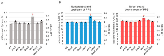 RecJ affects spacer acquisition precision and specificity. Spacers acquired by indicated cells were mapped to an area within 200 kbp upstream and downstream of the PPS for KD403 and indicated derivatives. (A) Percentage of inaccurately incorporated spacers (both shifters and flippers [38]) in indicated cultures. The numbers on the right axis show the ratios of inaccurately incorporated spacers to those obtained for WT cells. (B) Percentage of spacers with internal AAG trinucleotides. Data for spacers mapping to nontarget strand upstream of the PPS and target strand downstream are shown by blue and red bars, correspondingly. The heights of bars show mean values obtained in two independent experiments (black dots show values obtained in each individual experiment). The numbers on the right axis show the ratios of spacers with internal AAG trinucleotides to those obtained for WT cells. The dotted line shows the average level for the parental KD403 (“WT”) strain. Red asterisks mark values that significantly differ from the WT level according to pairwise proportional test with a p-value of 0.001.