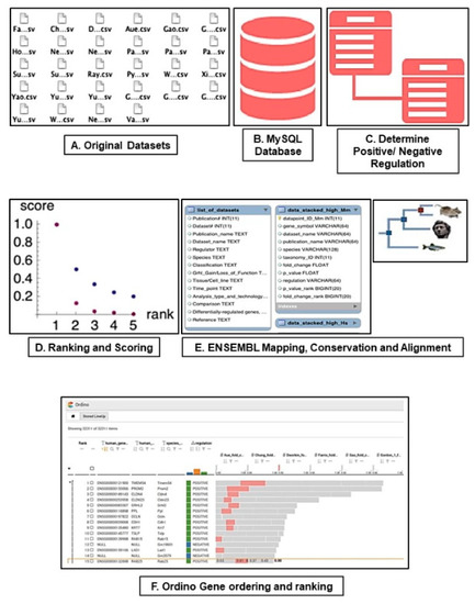 Meta-analysis pipeline methodology All published grh/Grhl Microarray/RNA-SEQ datasets were converted to a common file format (.csv, A) and imported into MySQL (B). Next, we determined whether genes within each dataset were positively or negatively regulated following functional modulation of grh/Grhl (C), and genes across the datasets were ranked according to their regulation within each dataset. To achieve a common gene ranking, the fold change rank-based scores from individual datasets were aggregated into the sum of scores for each gene, separately for positively and negatively regulated genes. (D). Each gene symbol within all datasets was mapped to the appropriate gene using Ensembl. After mapping, a table of all the human-mapped data was generated, searchable by the original gene symbol in every species (E). For interactive visualization and exploring, the data were exported from the MySQL database, re-structured and uploaded into Ordino (F).