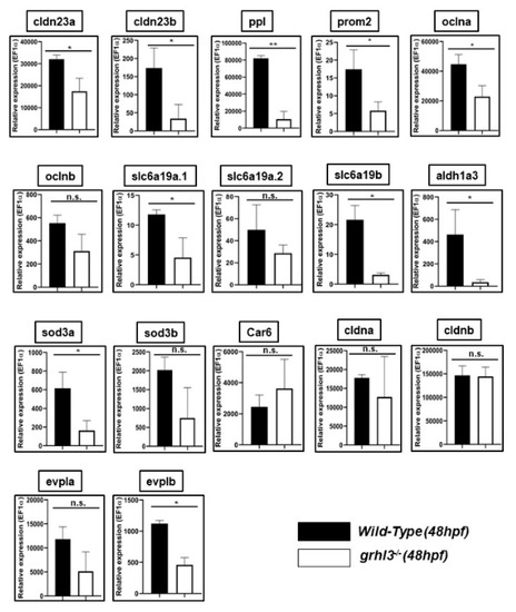 Q-RT-PCR analysis of zebrafish orthologue expression in 48 hours post-fertilisation (hpf) WT and grhl3-/- embryos. Gene expression was normalised to expression of housekeeping gene EF1a. Of the 18 fish orthologues selected, 10 showed differential expression in WT (black bars) vs grhl3-/- (white bars) embryos. * p < 0.05, ** p < 0.01, n.s., non-significant.