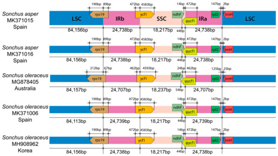 Comparison of the border positions of the large single copy (LSC), small single copy (SSC), and inverted repeat (IR) regions among five weedy Sonchus chloroplast genomes representing S. asper and S. oleraceus. Gene names are indicated in the boxes and their lengths in the corresponding regions are displayed above the boxes. Ψ indicates a pseudogene.