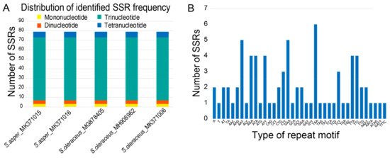 Simple sequence repeat (SSR) number per distribution and repeat type of five accessions of weedy S. asper and S. oleraceus chloroplast genomes. (A) Variation in the numbers of SSRs detected in five chloroplast genomes of weedy S. asper and S. oleraceus. (B) Number of SSR motifs in different repeat motifs of each weedy Sonchus chloroplast genome.